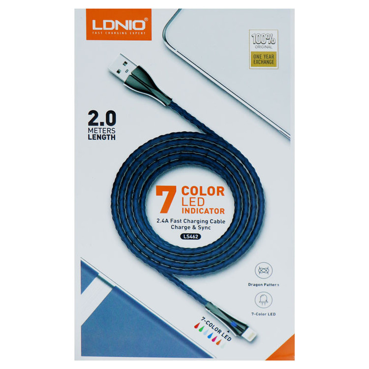 برند LDNIO مدل های مختلفی از کابل های شارژ را در مدل های مختلف تولید می کند که LDNIO LS462 مجهز به کانکتور Micro USB بوده و برای شارژ و انتقال اطلاعات در دستگاه های سازگار با این درگاه مورد استفاده قرار می گیرد. کانکتور کابل از جنس آلیاژ آلومینیوم ساخته شده، علاوه بر این دارای نورپردازی به صورت ۷ رنگ در قسمت کانکتور می باشد، که زیبایی خاصی را به آن در طول شارژ خواهد بخشید و شما می توانید به راحتی در محیط های تاریک کانکتور کابل را پیدا کنید. کابل اندرویدی LS-462 با شدت جریان عبوری ۲٫۴ آمپر، دستگاه شما را شارژ می کند. همچنین روکش کابل آن از جنس PVC با روکش پارچه است که در برابر کشیدگی، پارگی و خمیدگی مقاومت بالایی دارد. طول کابل حدود ۲ متر می باشد که طولی مناسب برای استفاده راحت تر کاربر از گوشی در زمان شارژ و … خواهد بود و محدودیت خاصی برای کابر ایجاد نخواهد کرد.