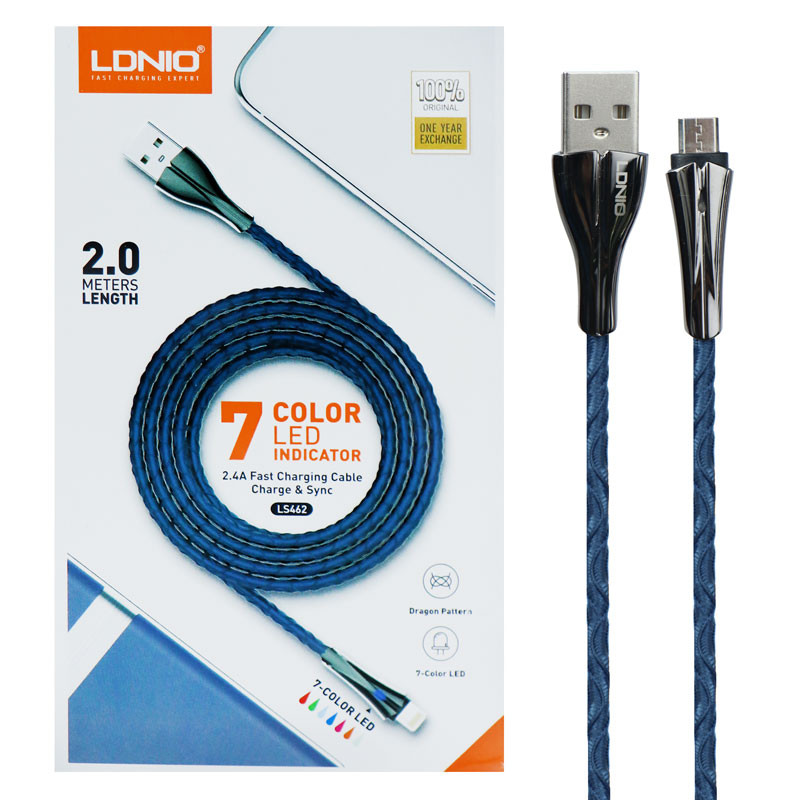 برند LDNIO مدل های مختلفی از کابل های شارژ را در مدل های مختلف تولید می کند که LDNIO LS462 مجهز به کانکتور Micro USB بوده و برای شارژ و انتقال اطلاعات در دستگاه های سازگار با این درگاه مورد استفاده قرار می گیرد. کانکتور کابل از جنس آلیاژ آلومینیوم ساخته شده، علاوه بر این دارای نورپردازی به صورت ۷ رنگ در قسمت کانکتور می باشد، که زیبایی خاصی را به آن در طول شارژ خواهد بخشید و شما می توانید به راحتی در محیط های تاریک کانکتور کابل را پیدا کنید. کابل اندرویدی LS-462 با شدت جریان عبوری ۲٫۴ آمپر، دستگاه شما را شارژ می کند. همچنین روکش کابل آن از جنس PVC با روکش پارچه است که در برابر کشیدگی، پارگی و خمیدگی مقاومت بالایی دارد. طول کابل حدود ۲ متر می باشد که طولی مناسب برای استفاده راحت تر کاربر از گوشی در زمان شارژ و … خواهد بود و محدودیت خاصی برای کابر ایجاد نخواهد کرد.